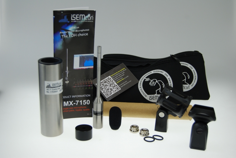 EMX-7150 Mikrofon + Halteklammer mit Adapterschraube + Shockmount mit Adapterschreube +Windschutz, Kalibrierdaten per download von my . isemcon.com - SC-1 Kalibrator, CA-1/4 Kalibrieradapter + 2x Neoprentasche